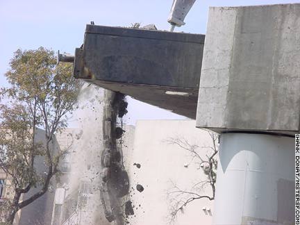 Sunday, April 6, 2003. Demolition of the Central Freeway's Fell Street Off-Ramp is well underway at Valencia and Market streets. The demolition represents the end of a decades-long battle known as the Freeway Revolt.
