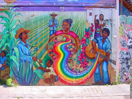 San Francisco is a great Mural Town. Throughout history, murals have been used to communicate the scale and drama of the artists' themes. Mission District murals often depict the struggle for human rights and freedom by the working class. Choose the links to see how San Francisco paints the town.