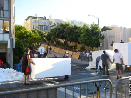 ![]() On Thursday, September 29, 2005, Olympic gold medalist Johnny Moseley brought "Icer Air 2005" to San Francisco. Two hundred tons of snow were brought in so that Moseley and other top ski aerialists could make the daring jump, northbound from Fillmore and Vallejo Streets, over Broadway, ending on Green Street. |