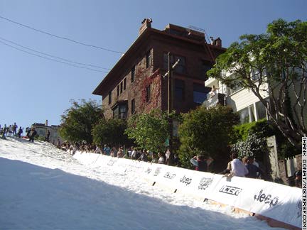 ![]() On Thursday, September 29, 2005, Olympic gold medalist Johnny Moseley brought "Icer Air 2005" to San Francisco. Two hundred tons of snow were brought in so that Moseley and other top ski aerialists could make the daring jump, northbound from Fillmore and Vallejo Streets, over Broadway, ending on Green Street. |