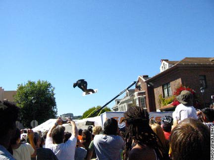![]() On Thursday, September 29, 2005, Olympic gold medalist Johnny Moseley brought "Icer Air 2005" to San Francisco. Two hundred tons of snow were brought in so that Moseley and other top ski aerialists could make the daring jump, northbound from Fillmore and Vallejo Streets, over Broadway, ending on Green Street. |