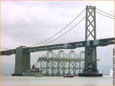 Oakland or Bust Cranes bound for the Port of Oakland from China pass under the Golden Gate Bridge (7:59 a.m.) and the Bay Bridge (9:55 a.m.), Friday, June 14. - Hank Donat