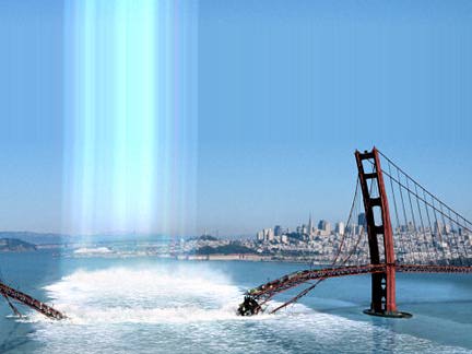 The Core is the predictable 2003 Hollywood sci-fi action drama about a mission to save the world after a massive electricity beam stops the rotation of the Earth's core. Among the pixelized disasters resulting from the planet's internal cataclysm is the destruction of the Golden Gate Bridge. Directed by Jon Amiel and starring Hillary Swank, Aaron Eckhart, Stanley Tucci, and Alfre Woodard. |