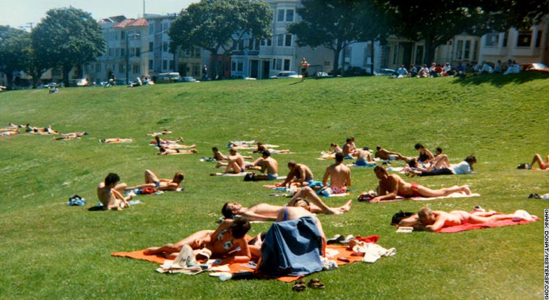 ![]() Sunbathers at Dolores Park, aka Dolores Beach, in April, 1988. << Back |