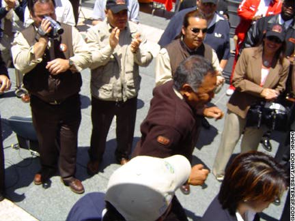 July 8, 2004: The 42nd Annual Cable Car Bell Ringing Contest was held at Union Square. The winner recieved his trophy from the 42nd mayor of San Francisco, Gavin Newsom. (If you think you remember that the 40th annual contest was held just last year, you are correct. A Muni historian said that records show the contest started a year earlier than was previously believed, making last year's winner, Ron East, the 41st champ.) The Competitors Doorman Tom Sweeney presented