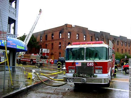The Haslett Warehouse, 680 Beach Street, smolders the morning after a March 17, 2002 fire destroyed the historic landmark along Fisherman's Wharf.