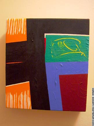 The apartment that poet Micah Ballard shares with photographer Sunnylyn Thibodeax is the kind of flat one is likely to find in Bohemian San Francisco. Furnishings consist of shelf cubes and some vintage cast-offs. The art on the walls is decidedly Dada, including an abstract painting by Gonzalez titled "Portrait of Felix McNee." |