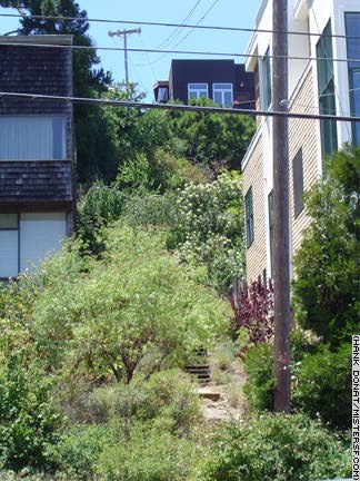 The property at 690 De Haro Street included a sanctuary for birds and butterflies, a footpath, and a hundred year-old house. Ineligible for landmark status because of past remodeling, the house and grounds were sold to developers. The old house was removed for construction of condominiums. The garden on the property, which is located next to a beautiful stairway, was mostly lost. A stroll up the adjoining hill, an unpaved block of 19th Street, reveals a novelty, #1919 19th, a private residence. Novel, unless you live at 2020 20th Street. Detail