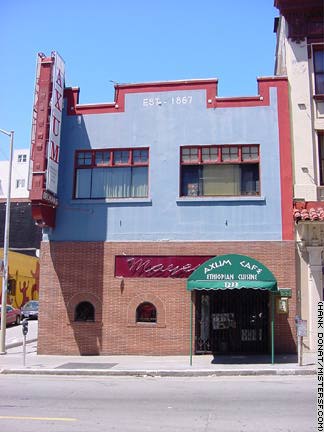 Maye's Original Oyster House, 1233 Polk Street, was an old style San Francisco fish house and an institution since 1867. Surly waiters, great food, and a piano bar all added to the character of this local favorite. Not long for the 21st Century, Maye's went under in 2001 and was replaced by Axum Cafe, an Ethiopian joint, the following year. |