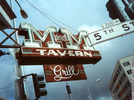 In October 2000, the M&M Tavern at 5th and Howard closed its doors after 66 years. So entrenched was this saloon in the City's newspaper culture that the Examiner once had a direct line from its newsroom to the bar. This was the place where drivers, printers, writers, editors, and messengers all mingled in a spirit typical of the City's camaraderie across social lines. Always filled with smoke in the old days and gamblers in the even older days, the joint was founded by Martin McVeigh and Mike Malloy shortly after prohibition was lifted in 1934. Detail |