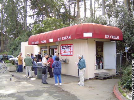 Pon & Hom's was a favorite in Golden Gate Park for 24 years before its owners closed the hot dog stand on Halloween, 2004. By the time of the closing, construction of the new De Young Museum, California Academy of Sciences, and Music Concourse parking garage had made a ruin out of what was Pon & Hom's plum location behind the band shell. Owners Cary Fong and Eugene Pon thanked their customers by providing free hot dogs from the stand during its final weekend. |