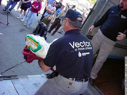 In March 2001, the Names Project AIDS Memorial Quilt left San Francisco for its new home in Atlanta, Georgia. Invented by activist Cleve Jones in 1985, the quilt became a 54-ton weapon in the fight against AIDS. As the epidemic grew in the '80s, nothing personalized the toll of the disease for a global audience like the panels of the quilt, each fashioned by loved ones in memory of someone who died from AIDS. At emotional farewell ceremonies here, Jones said he was gratified that the quilt would be based in Atlanta, where it can be used to educate African-American communities and others that are being particularly hard hit with new HIV infections. Emphasizing that the war against AIDS is a political one as much a health crisis, Jones denounced governments for allowing the disease to infect 40 million people world-wide as AIDS enters its third decade. Jones, Congresswoman Nancy Pelosi, Supervisor Mark Leno, District Attorney Terrence Hallinan and others folded the final section of the quilt to be loaded onto a moving van. Each spoke of people they loved who were lost to AIDS, from friends and lovers, to brothers and sisters, even the flower girl at Pelosi's wedding. Many of the original volunteers who created panels for the quilt were on hand to say good-bye.