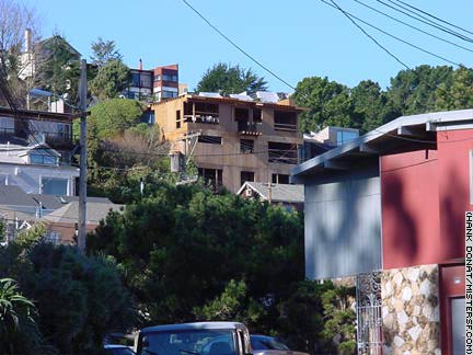 Every year San Francisco comes closer to losing another among a finite number of century old redwood cottages. This footprint is all that's left of one such irreplaceable cottage at 132 Laidley Street in the southern part of Noe Valley. When it was demolished in 2000, its redwood planks filled a dumpster with a reddish gleam. See the property as it appeared in 1907. Preservationists are in a constant struggle for development that balances neighborhood character with the wants of commercial interests in San Francisco. An association of Noe Valley neighbors wary of development here sprang up overnight to prevent the construction of a mansion on a hill not far from the Laidley property. The neighborhood group was no match for the lawyers, architects, and city planners lined up against them. Construction of a so-called monster home - a 4,000 square foot, 4-story, single-family home with working elevator - on Zircon Place was well underway in 2001. |