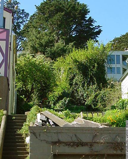Every year San Francisco comes closer to losing another among a finite number of century old redwood cottages. This footprint is all that's left of one such irreplaceable cottage at 132 Laidley Street in the southern part of Noe Valley. When it was demolished in 2000, its redwood planks filled a dumpster with a reddish gleam. Preservationists are in a constant struggle for development that balances neighborhood character with the wants of commercial interests in San Francisco. An association of Noe Valley neighbors wary of development here sprang up overnight to prevent the construction of a mansion on a hill not far from the Laidley property. The neighborhood group was no match for the lawyers, architects, and city planners lined up against them. Construction of a so-called monster home - a 4,000 square foot, 4-story, single-family home with working elevator - on Zircon Place was well underway in 2001. |