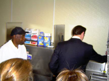 ![]() Mayor Gavin Newsom washes dishes with Willie Sledge (left). Sledge is one of 21 formerly homeless employees out of a staff of 50 working for Man J. Kim's Sears. |