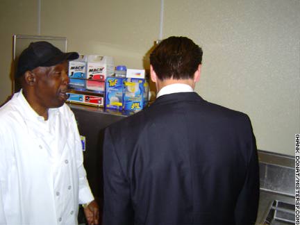 ![]() Mayor Gavin Newsom washes dishes with Willie Sledge (left). Sledge is one of 21 formerly homeless employees out of a staff of 50 working for Man J. Kim's Sears. |