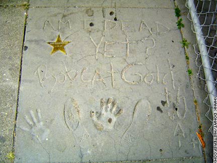 "Arriving at the Carmichael School construction site, I find that the partial handprints and signatures of Whoopi Goldberg, George Takei, Bobcat Goldthwait, Amy Wright, and Severn Darden are all that remain of the San Francisco Studios Walk of Fame, 375 7th Street. Indeed, Herve Villechaize has been lopped off and paved over. Only the top half of his brass star is intact." - More about the walk of Fame in Heart of the City 06/29/04 Detail: Former Walk of Fame Location