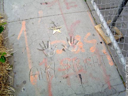 "Arriving at the Carmichael School construction site, I find that the partial handprints and signatures of Whoopi Goldberg, George Takei, Bobcat Goldthwait, Amy Wright, and Severn Darden are all that remain of the San Francisco Studios Walk of Fame, 375 7th Street. Indeed, Herve Villechaize has been lopped off and paved over. Only the top half of his brass star is intact." - More about the walk of Fame in Heart of the City 06/29/04 Detail: Former Walk of Fame Location
