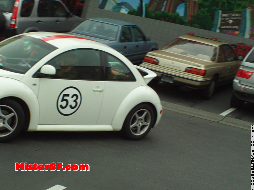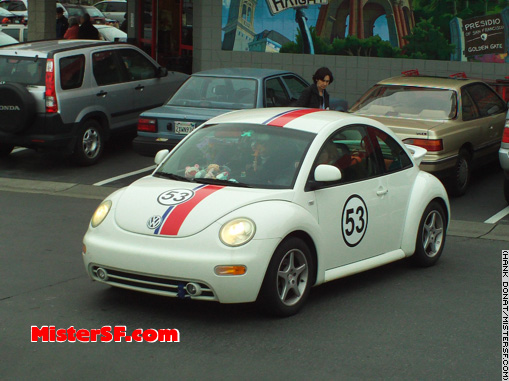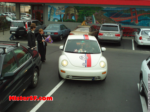 originally posted 1/23/09: Dateline: Masonic Avenue near Geary Street, where Mister SF spots a Herbie the Love Bug loading passengers at Trader Joe’s.