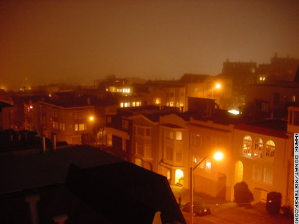 "The fog comes Cats are okay, but when Mister SF sees the fog coming in over the Gate Bridge from the Marina, he's reminded of King Kong, the beast's fingers gently wrapped around the Empire State Building. No matter how you look at it, the fog is San Francisco's mood ring. Here's another shade. Foghorns The City's foghorns wail in a variety of sounds. There are sirens (single pitch contralto), the air horn (single pitch baritone), and the diaphone (various sounds, 200 decibels at max power.) |