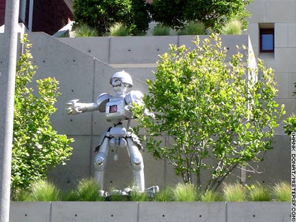 Seen here in June, 2003, sculptor Nemo Gould's racy Mr. Roboto is known as Goliath by the kids of the 'bot's owners, Nicola Miner and Robert Mailer Anderson. Depending on your taste, it's either an eye-catching sentinel or an eye sore of a lawn ornament along the row of mansions on Broadway between Lyon and Baker Streets in Pacific Heights. When visiting Goliath, don't forget to check out the house next door at 2845 Broadway. In 2002, the unfinished house at #2845 became the most expensive home in city history when it sold for $32 million. Detail |