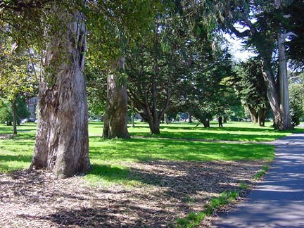 The oldest trees in Golden Gate Park are located in the Panhandle. The Diggers handed out food here every day during their prominence in the Haight-Ashbury movement in the late '60s. The sprawling grove runs from Baker Street to Stanyan, between Fell and Oak. Detail