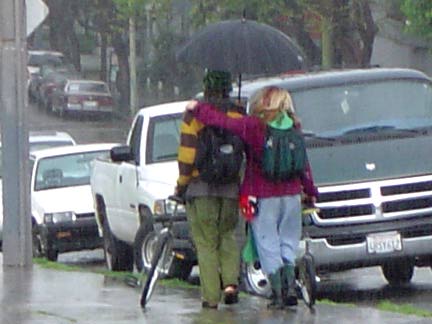 We 2 R 1: San Francisco is an all-weather city when it comes to love and romance. This couple walks a pair of unicycles past Duboce Park during a sudden shower in July, 2005.