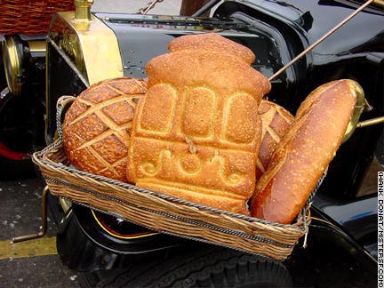 ![]() Boudin loaves on the bumper of a vintage delivery truck. |