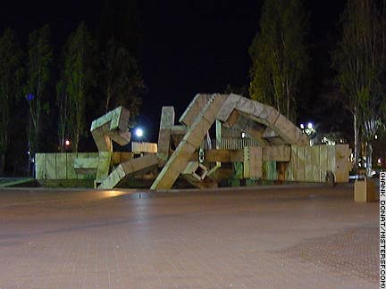 The Vaillancourt Fountain at Justin Herman Plaza and Four Embarcadero Center has been widely reviled since it was built in 1971 by French-Canadian sculptor Francois Vaillancourt. The late Herb Caen said it looked like a pile of poop while others are content to call it a mere eyesore. So harsh was public criticism that its embittered creator was ridiculed out of town. Built on land cleared for the Embarcadero Freeway and BART, the fountain is built on the site of former hotels and bars in an area once well populated by seamen. When it's working, the fountain releases thousands of gallons from its apertures. Large square stepping stones allow a walk through the cluster of cubic plumbing, enveloping the visitor in its roaring presence. An upper catwalk is equally fun. Clearly Mister SF endorses the Vaillancourt Fountain in spite of its industrial design. We can't put Corinthian columns on everything!