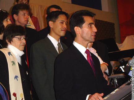 ![]() 12/07/04: At Glide Memorial Church, Assemblyman Mark Leno (right) announces the "Religious Freedom and Civil Marriage Protection Act." |