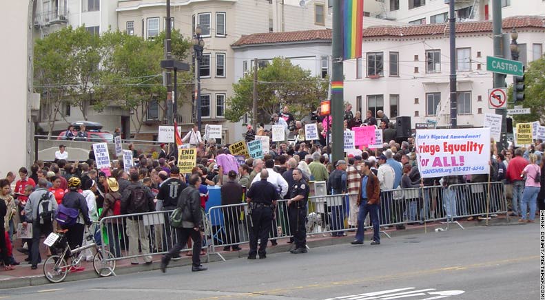 Wedstock: On the morning of August 12, 2004, the California Supreme Court invalidated the 4,000 marriage licenses issued to same-sex couples in San Francisco from February 11 - March 12. Supporters responded in a familiar fashion, with a rally at Castro and Market and a march to City Hall. The reversal was met with a range of emotions. Some were devastated; Supervisor Tom Ammiano later spoke of friends who cried on his shoulder after he addressed the rally. (I and others had a difficult time mustering outrage. Sure, it sucks to be degraded once more. But, as the constitutional challenge against denying gays the right to marry moves forward, Californians will not be able to look at Phyllis and Del and say that they are wrong. Everything in their faces tells me that history is on our side. This is not our last day in this struggle, but neither is it our first day. And so, we march down Market Street once more. - HD) Detail