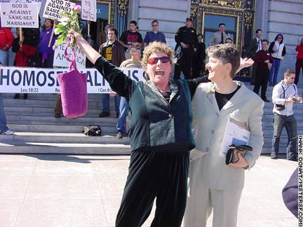 Before praising gay marriage on the Chris Matthews Show on NBC shortly after the marriages began, the gay conservative writer and commentator Andrew Sullivan said, "I know I'm supposed to be a pundit here, but this is my life." (Sullivan's remarks were prescient of the removal of Rachel Gordon from the story by the San Francisco Chronicle after the reporter married her lesbian partner on March 9. - HD) While each gay or lesbian member of the media will make their own choice in regard to how they cover the story, as a Wedstock groom, Mister SF's editorial position is clear. Please allow these images of anti-gay demonstrators to speak for themselves and read Heart of the City 03/09/04.