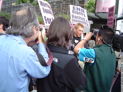 ![]() Detail: KTVU, the Chronicle, and someone else line up to photograph handsome newlyweds Jim Spinello and Bill Lenker. |