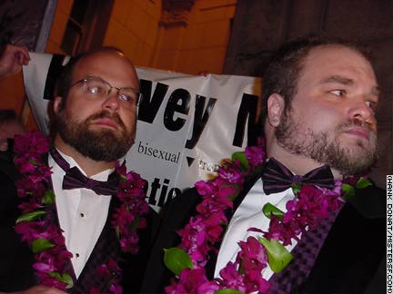 Stuart Sanders and Ross Ladouceur of Boulder Creek were among the first couples turned away for a marriage license following the decision by the California Supreme Court to halt Wedstock. Sanders and Ladouceur made their vows anyway, in front of 600 witness at Civic Center.