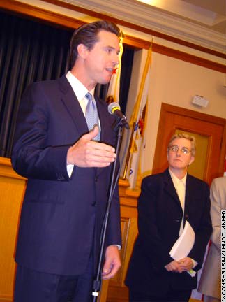 Wedstock: 08/12/04: The California Supreme Court ruled that Mayor Gavin Newsom exceeded his authority and unlawfully instructed city employees to issue marriage licenses to same-sex couples in San Francisco from Feb. 12 - March 11. Newsom, City Attorney Dennis Herrera, the couples, and their supporters vowed to continue the fight for gay marriage rights in California. In a lawsuit brought against the City by California's Attorney General Bill Lockyer, the court ruled 5-2 that none of the couples was ever legally married. The court also said the City should refund the $82 license fee paid by each couple. In accepting the court's ruling Newsom said he had succeeding in "putting a face on discrimination." He encouraged every couple to share their stories with friends, relatives and neighbors. The mayor said he was undaunted in his commitment to equal justice as the push for gay marriage continues in spite of opposition on the state and federal levels. Herrera will argue the constitutional issue of discrimination in a separate case.