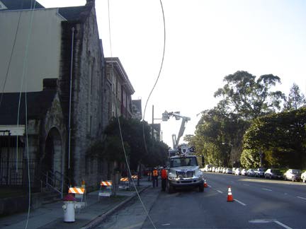 Overhead wires become a thing of the past along Oak Street at Baker in February, 2007.