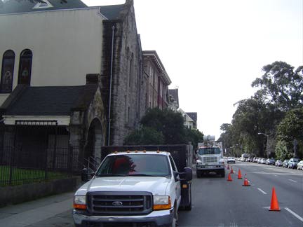 ![]() Overhead wires become a thing of the past along Oak Street at Baker in February, 2007. |