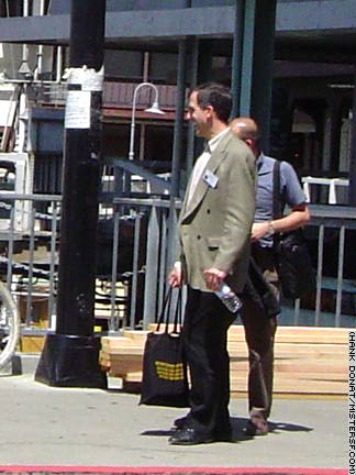 ![]() David Johnson, aka the Bushman, hides behind a couple of eucalyptus branches on Jefferson Street between Jones and Taylor in order to scare the daylights out of tourists. At this writing in April, 2004, the City has been unable to make any public nuisance charges stick against Johnson, who has achieved a level of infamy with visitors from all over the world. Detail I |