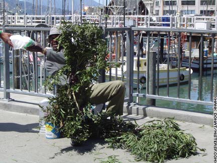 ![]() David Johnson, aka the Bushman, hides behind a couple of eucalyptus branches on Jefferson Street between Jones and Taylor in order to scare the daylights out of tourists. At this writing in April, 2004, the City has been unable to make any public nuisance charges stick against Johnson, who has achieved a level of infamy with visitors from all over the world. Detail