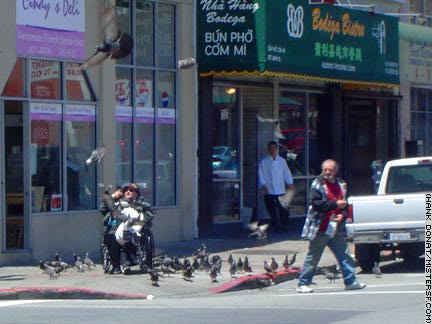 ![]() "On Van Ness Avenue near Pacific, I watched as a pigeon walked, yes walked, across four lanes of traffic and the median for a bounty consisting of exactly one tortilla chip, only to have it intercepted by a gull in the final inches. Vermin just can't get an even break anymore, and I'm not talking about term limits. In San Francisco, where the most creative men and women have migrated like swallows to Capistrano for decades, we've found only a few words to describe our much reviled pigeon population. Appellations range from winged rats, to rats with wings, to my favorite - Flying Rats. Get the picture?" Heart of the City 03/12/02 Detail