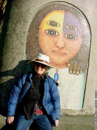Grace Sevy is the artist and photographer whose photo collage series "San Francisco Segments: People and Places" includes a piece inspired by one of Beniamino Bufano's sculptures. Grace is seen here in front the Madonna at the Great Meadow, Upper Fort Mason. |